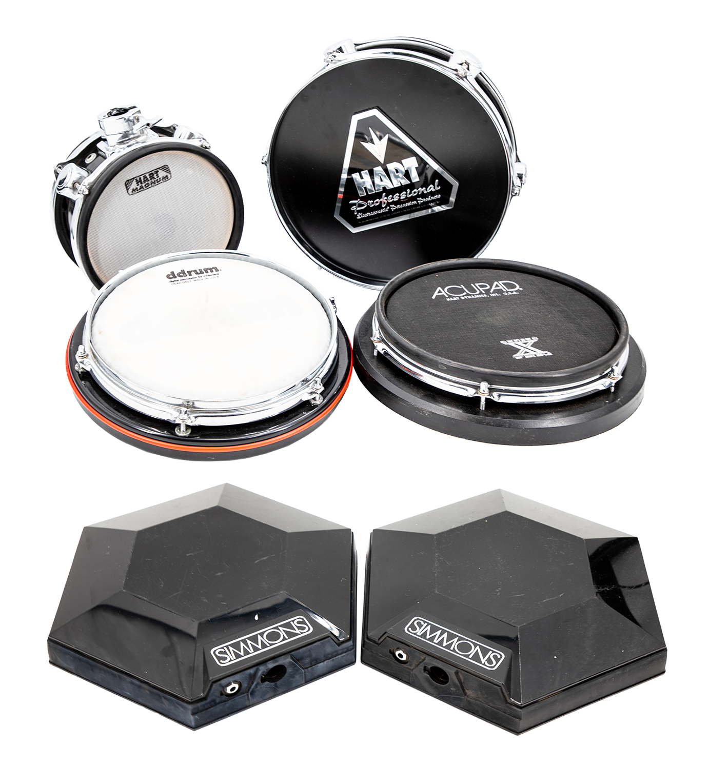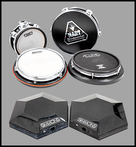 Rick's Simmons electronic drum heads, Hart electronic drum heads, ddrum brand practice pad, and Acupad practice pad. These Simmons drum heads were used during the start of the Hysteria Tour and can be seen in the videos from that period. From the Collection of Rick Allen.