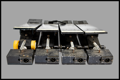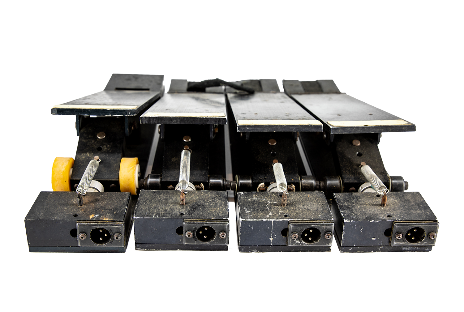 Four of Rick's Shark drum pedals, created especially for Rick and used on the Hysteria Tour beginning in 1987. From the Collection of Rick Allen.