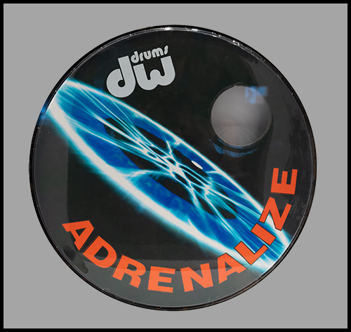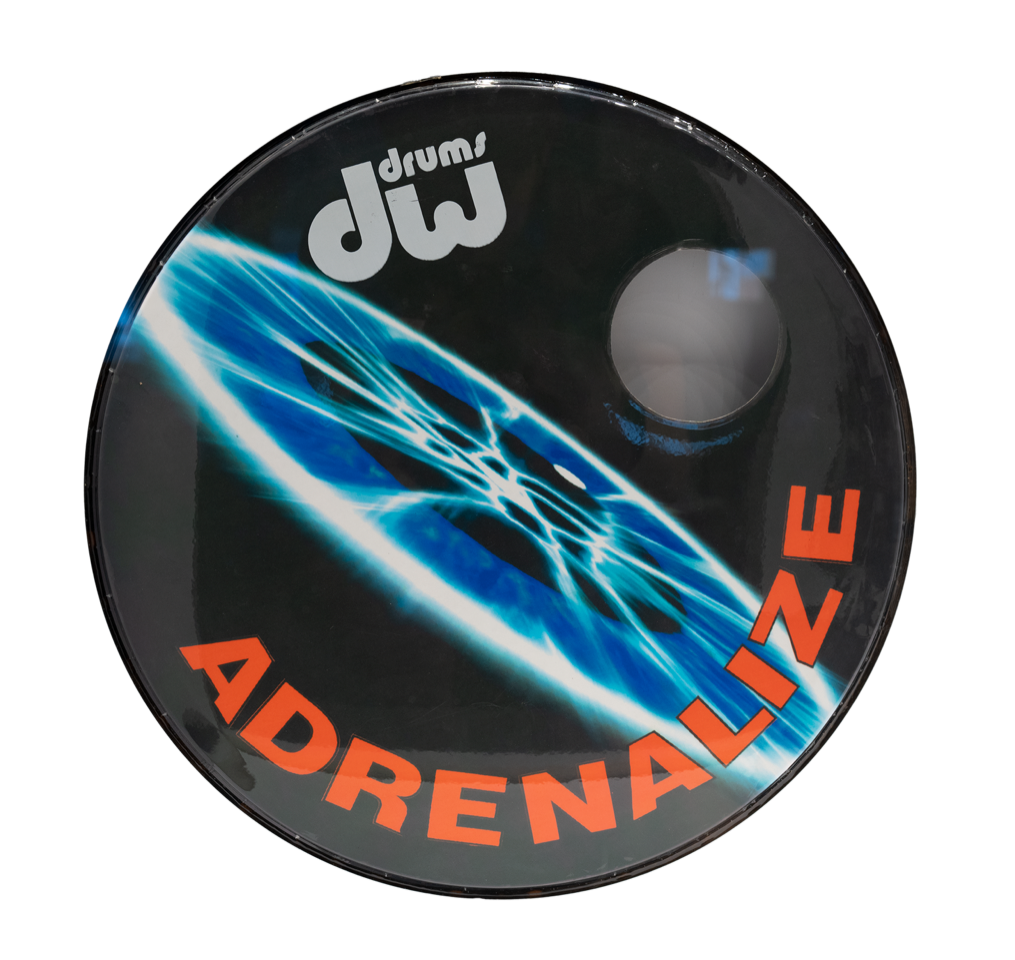 DW bass drum head that Rick used on the Adrenalize "Seven Day Weekend" Tour, 1992-1993. From the Collection of Rick Allen.