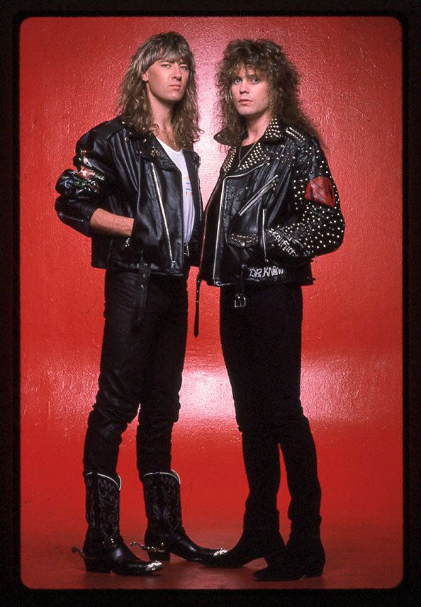 Promotional photo featuring Joe and Sav in leather jackets, circa 1988. Sav also wore this jacket in the "Rocket" video. Photo: Ross Halfin. From the Collection of Def Leppard.