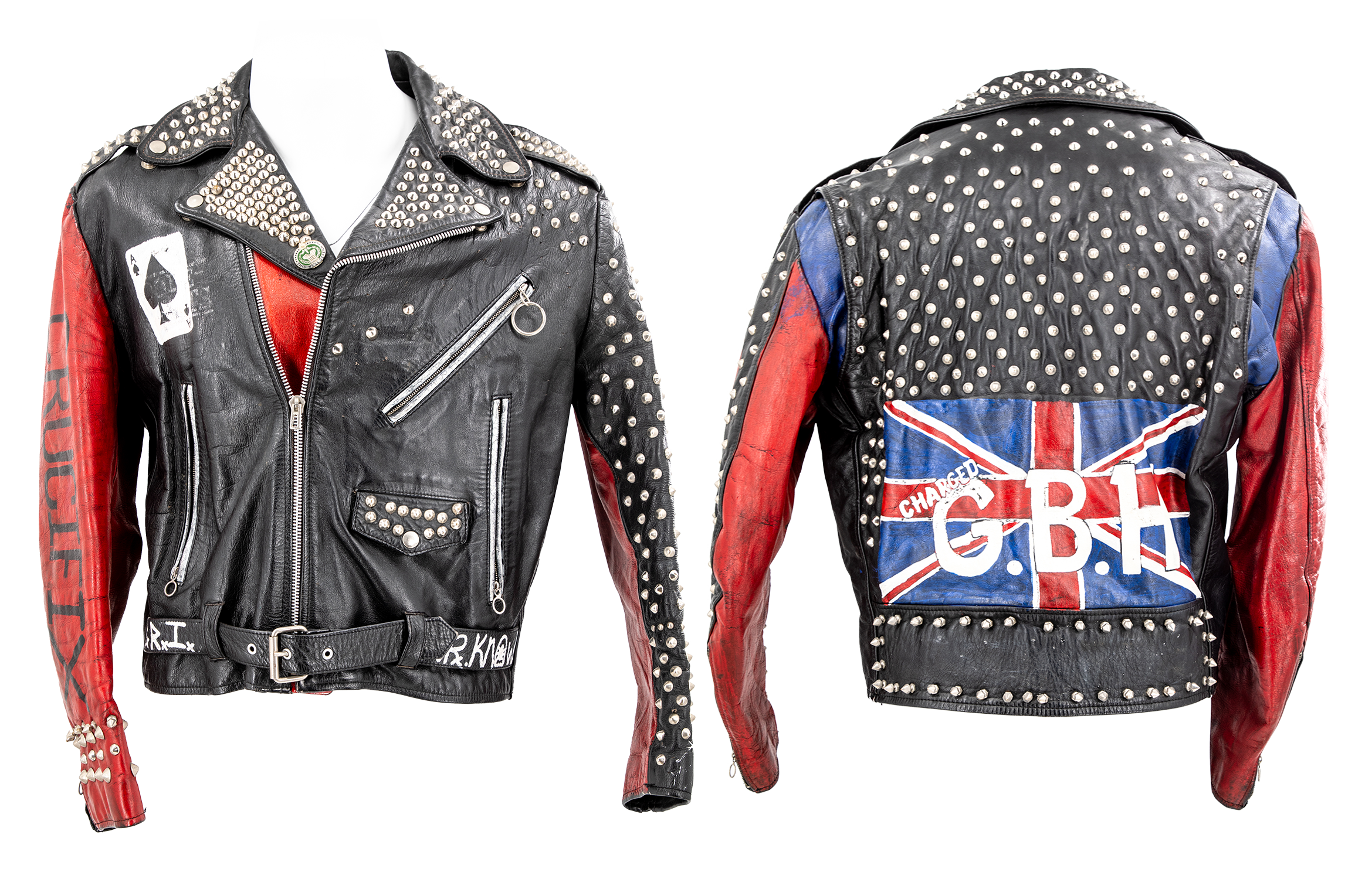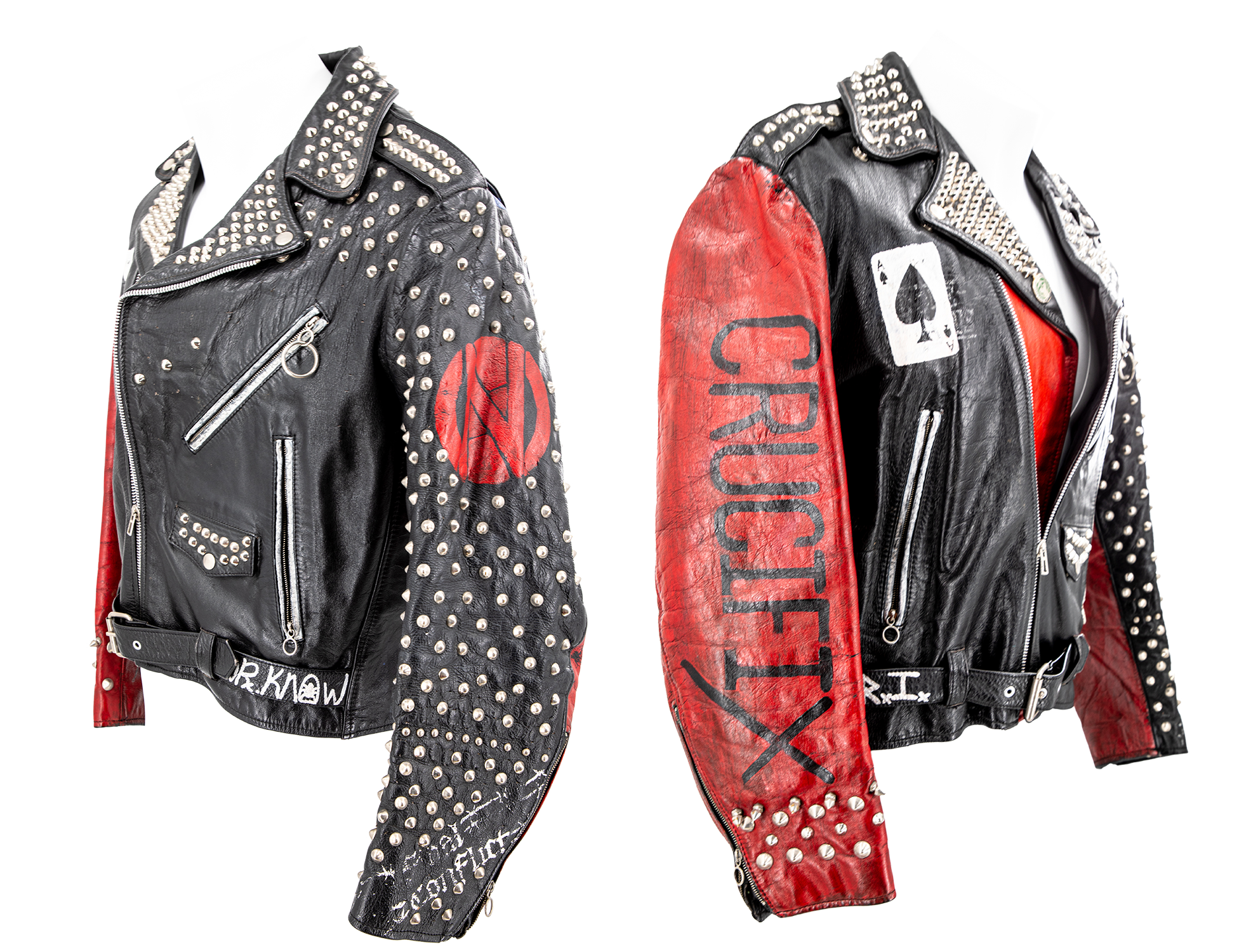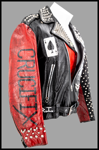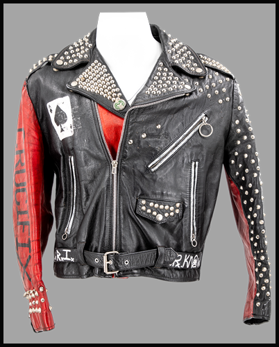 Sav donned this spiked and studded black leather biker jacket for the 1988 "Rocket" video. This punk rock tribute jacket honors some of the greatest punk acts of all time, including Conflict, Dr. Know, Mötorhead, Crucifix, and G. B. H, with hand-painted logos over black. From the Collection of Rick Savage.
