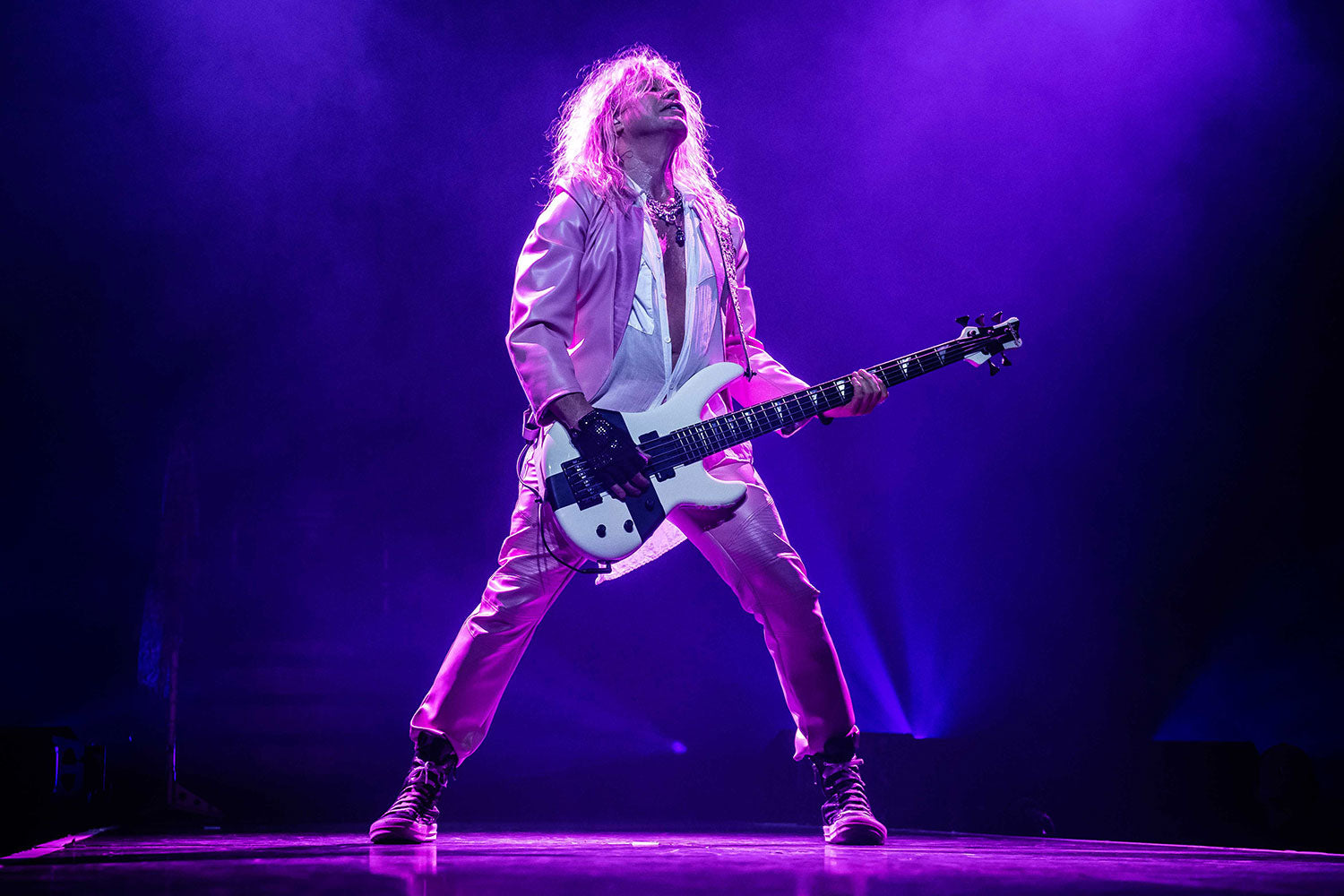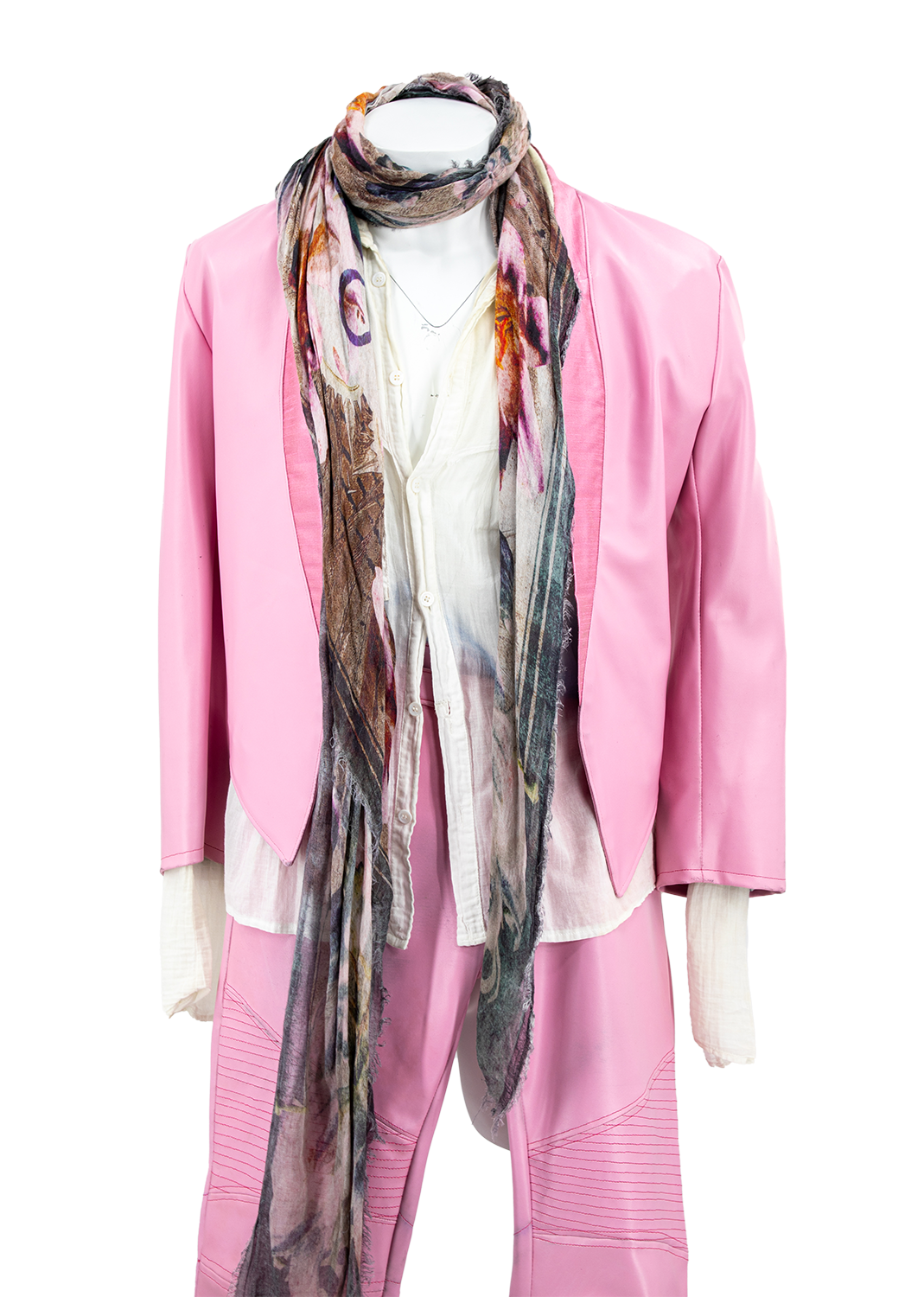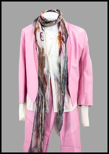 Sav's pink leather suit worn on the 2018 Def Leppard World Tour. From the Collection of Rick Savage.