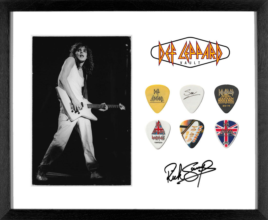 Six bass picks created for Sav to use on various performances including the band's 2019 Rock & Roll Hall of Fame induction. Photo: Ross Halfin. From the Collection of Def Leppard.
