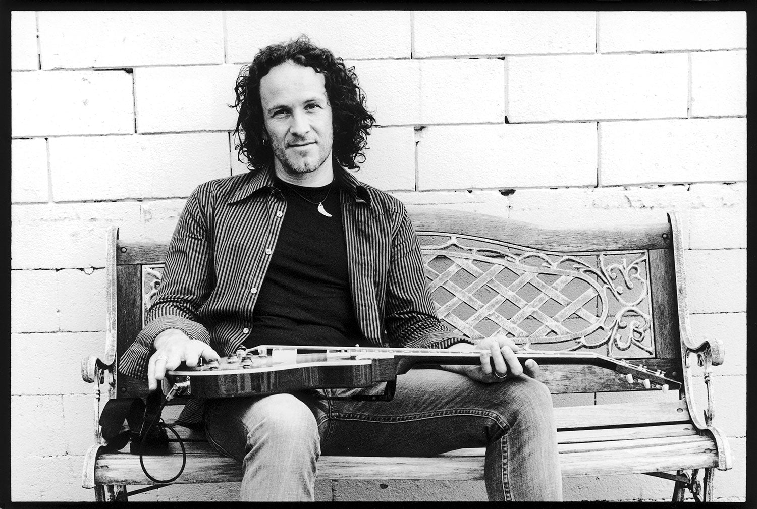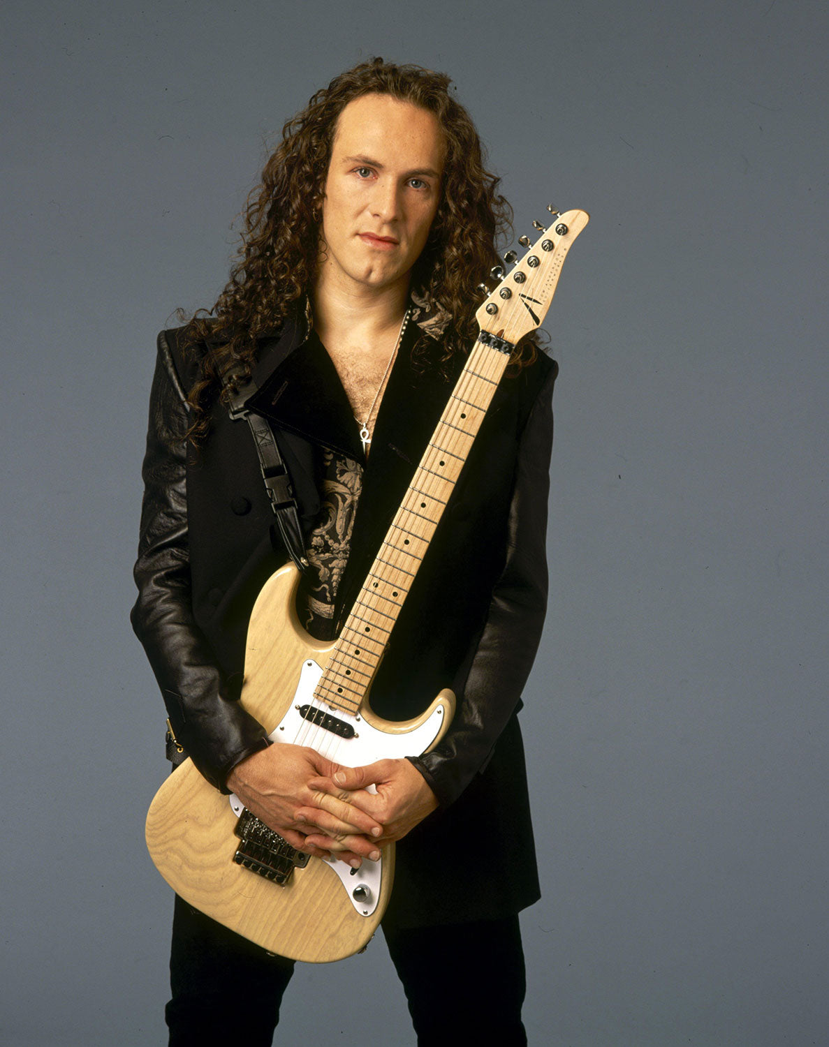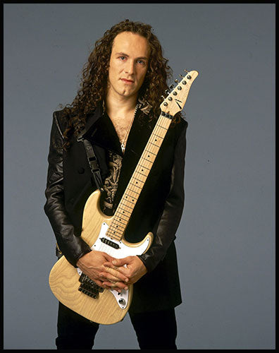 Portrait of Viv holding his Tom Anderson custom guitar, circa 1992. From the Collection of Def Leppard.