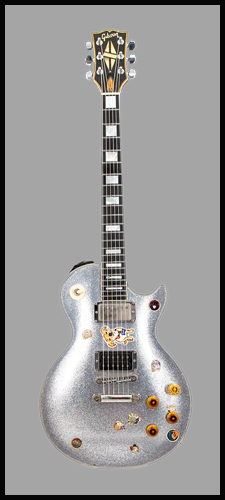 Viv's Jimmy Page-style Gibson Les Paul Standard with TonePros hardware. When he bought the guitar at a pawn shop in Nashville in 1993, it was a 1978 Custom, all-black. En route to record Slang, the guitar was heavily damaged and subsequently rebuilt. It has since become one of his favourite instruments. From the Collection of Vivian Campbell.