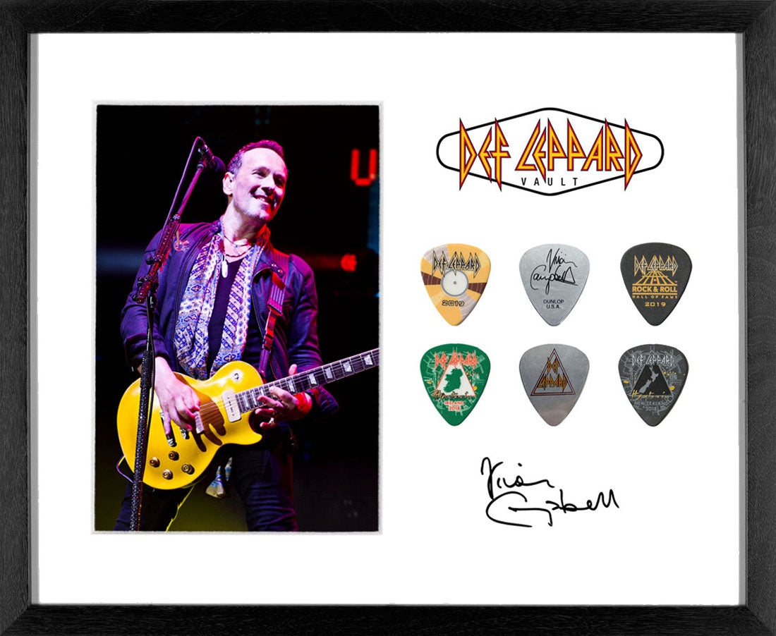 This plaque holds six of Viv's guitar picks created for use in various performances, including the 2018 Hysteria Tour through Ireland. Photo: Ross Halfin. From the Collection of Def Leppard.