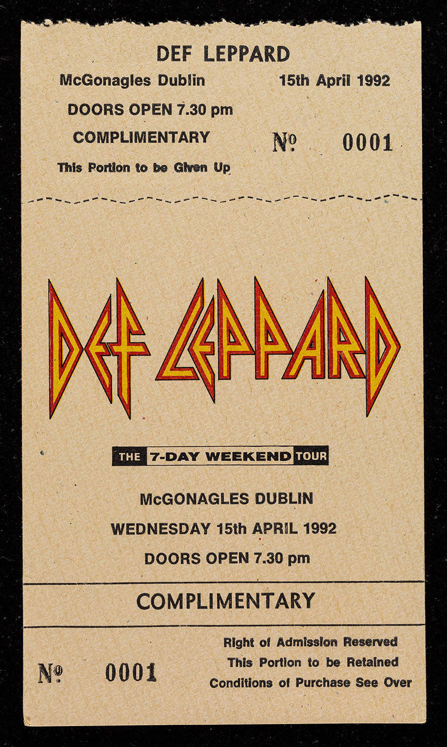 Ticket (numbered 0001) for Viv's first performance with Def Leppard, McGonagles, Dublin, Ireland, 15 April 1992. The show gave the band an opportunity to officially welcome Viv to the Def Leppard family, as well as warm up for the televised Freddie Mercury tribute a few days later. From the Collection of Joe Elliott.