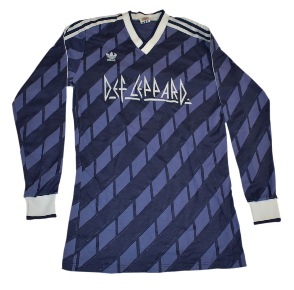 Made in 1987/88 this blue striped Adidas football jersey with white v-neck and cuffs. White Def Leppard logo adorns the chest, with Joe's number 9 printed on the back. A testament to the band's love of soccer that you can wear. From the collection of Def Leppard.