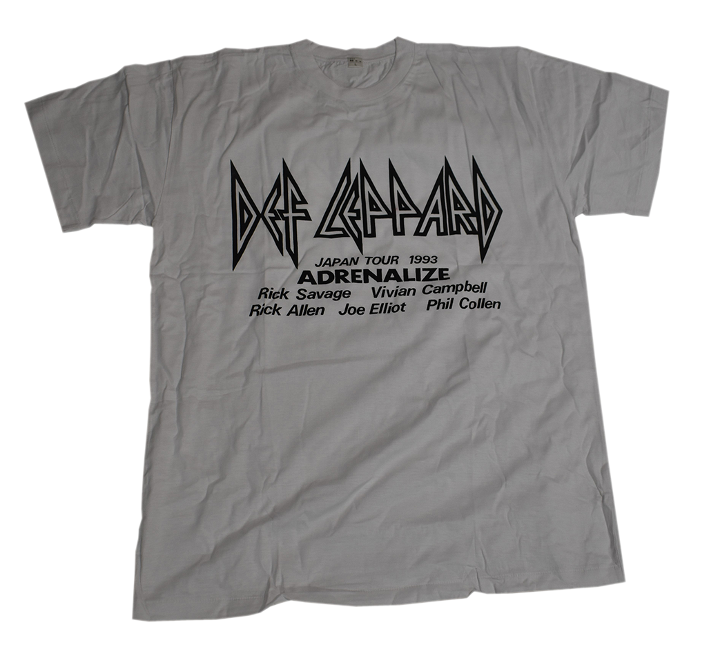 Back to basics with this plain white tee featuring a black Def Leppard logo. "Japan Tour 1993," "Adrenalize," and the names of the band members are printed on the front. The Japanese leg of the Adrenalize tour began in Sendai 15th June, 1993, and ended with three blazing shows at the Nippon Budokan 23rd June, 1993. From the collection of Def Leppard.