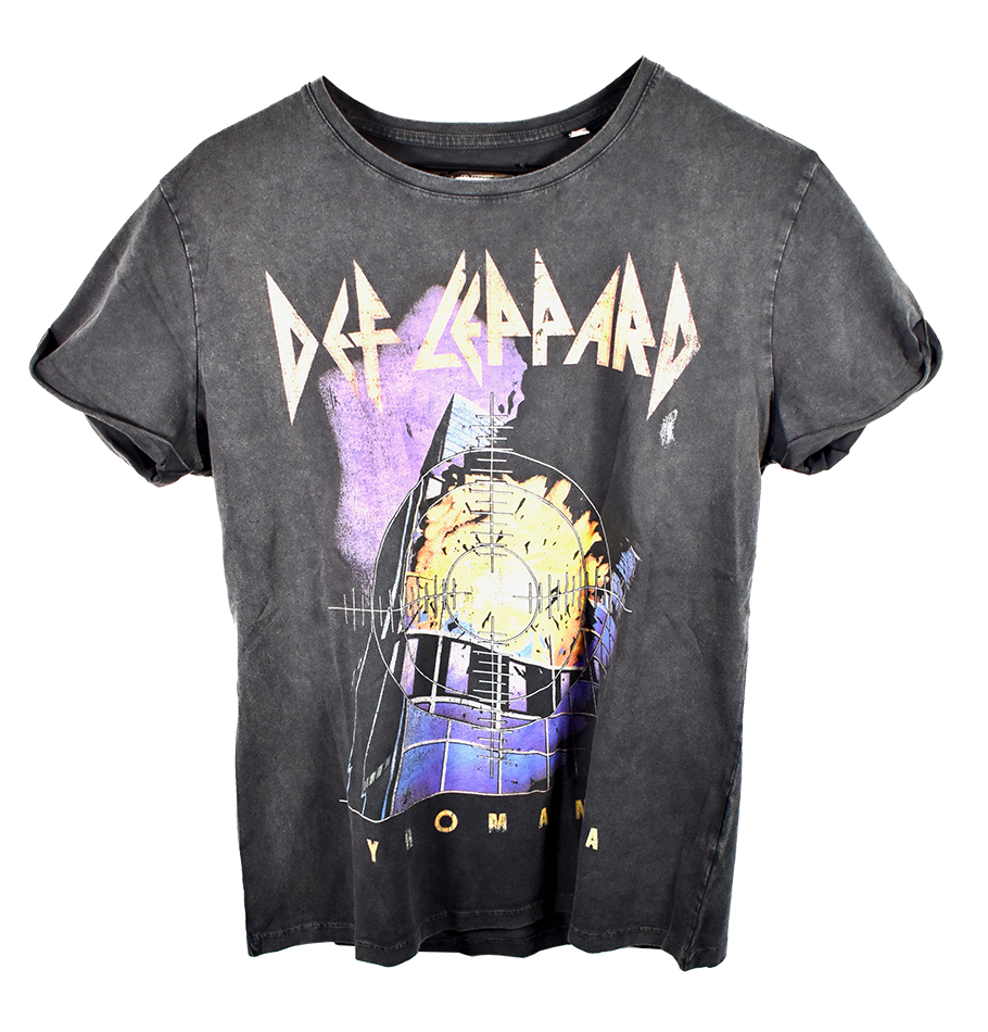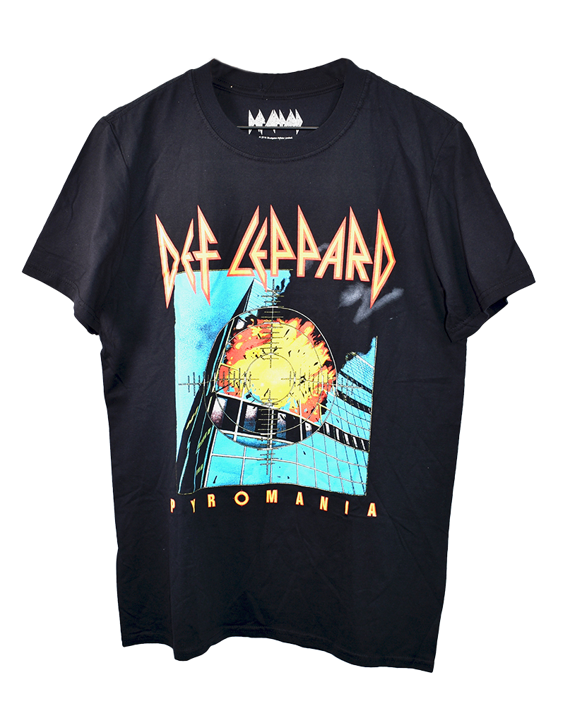 This distressed black t-shirt pays homage to the classic Pyromania album featuring cover art and yellow Def Leppard logo. From the collection of Def Leppard.