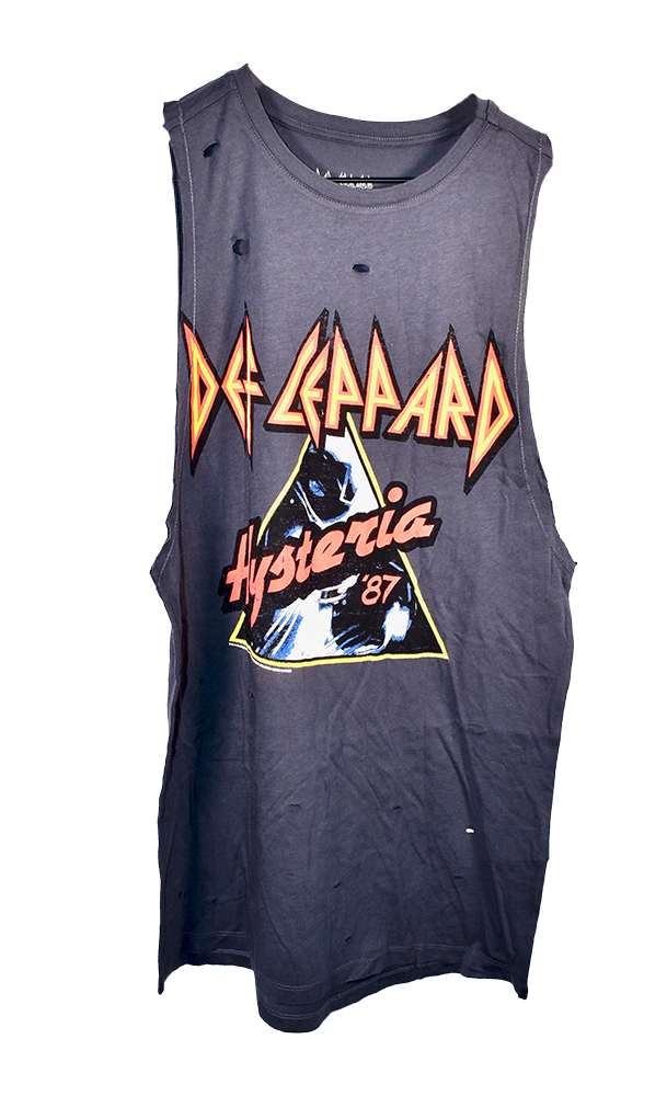 Sun's out evidently, as this distressed gray tank top is tailor-made for letting the guns out. An homage to Hysteria with classic screaming head and yellow and red Def Leppard logo across the chest. From the collection of Def Leppard.