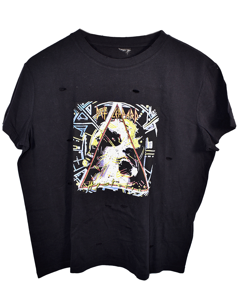 Distressed black t-shirt featuring the Hysteria album artwork. From the collection of Def Leppard.