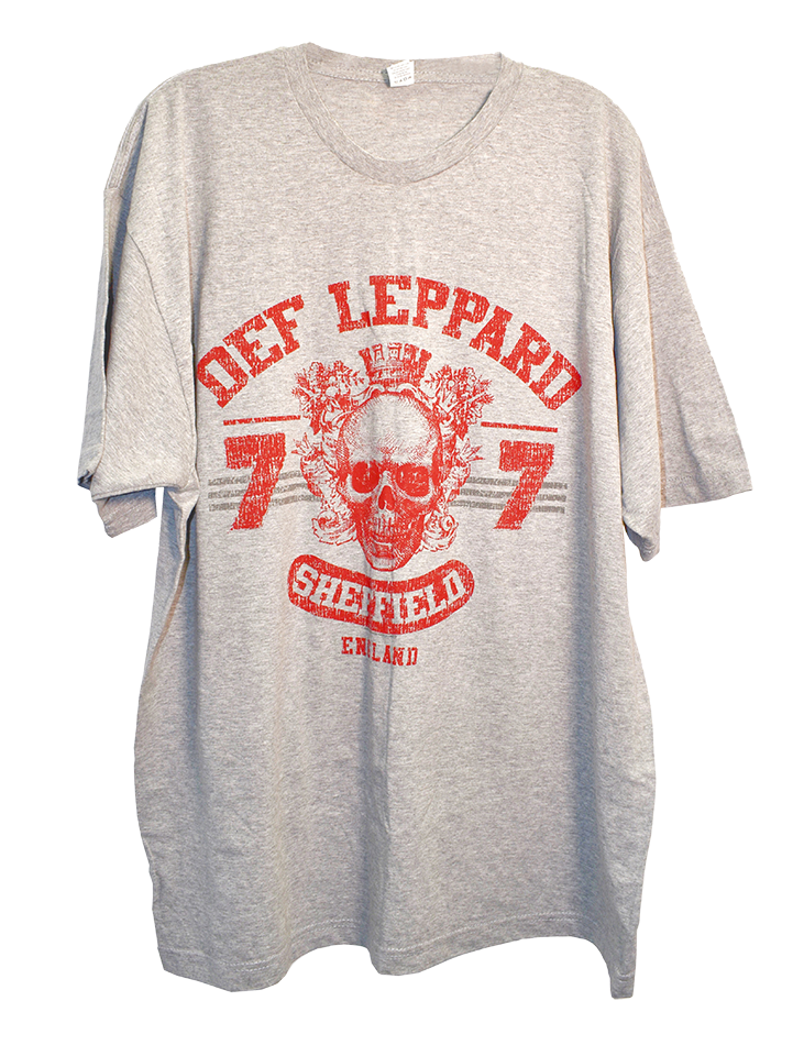 Grey short-sleeved t-shirt with red skull and crown crest, and Def Leppard 77 Sheffield England printed on the front. A celebration of the band's beginnings in 1977 in South Yorkshire. Was a merch item created in May 2005. From the collection of Def Leppard.