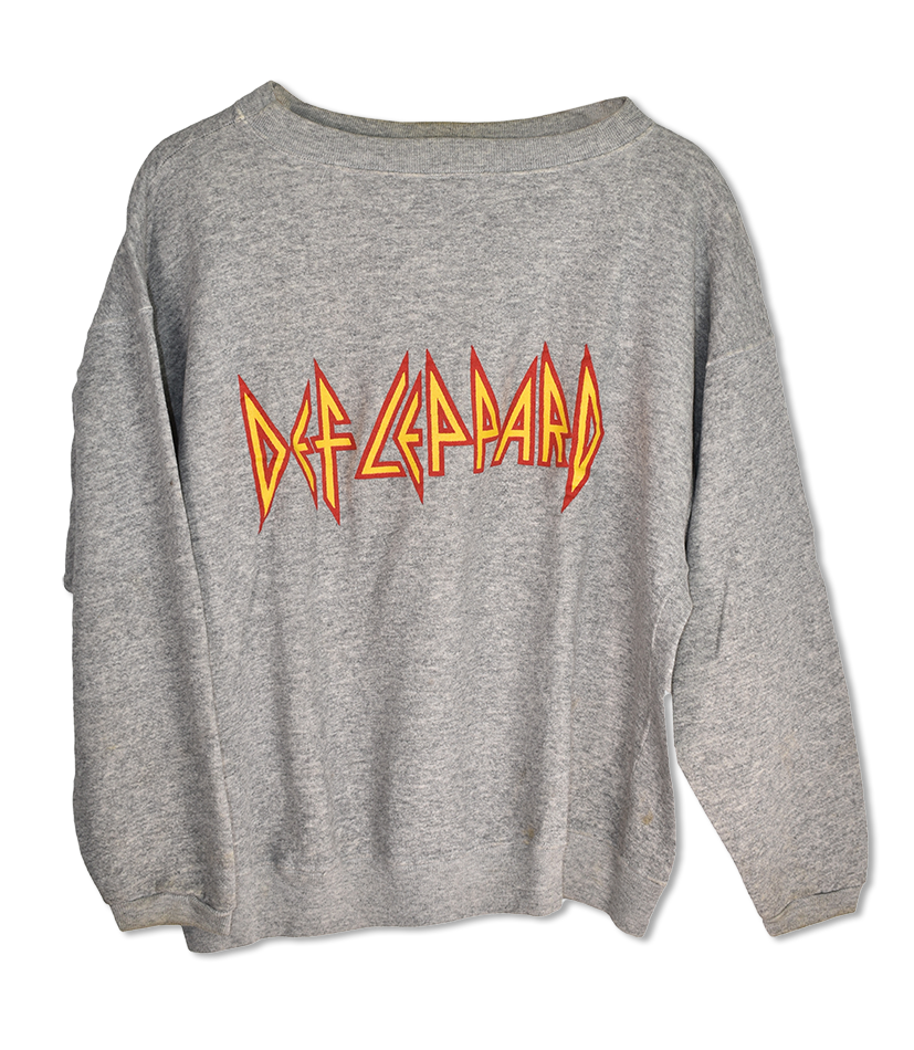Steve Clark's grey crewneck "Armageddon It" sweatshirt with classic yellow and red Def Leppard logo on the back, 1987. Joe speaks to the writing of this Def Leppard massive hit single: "Right, Armageddon It, to my memory, which is pretty thin on this one. It was a Sav idea from Booterstown in '84. And it started off as the most ridiculously simplistic, almost Germanic, marching tune. It was just the drum rhythm was very similar to what the song is now, but the guitar part just went, "Bah, bah, bah, bah." And that was it, it was so simplistic, it was silly. It was a vehicle for a vocal is what it was. And we came up with all these great phrases and it was just like loads of different melodies, and it was like ten different verses in one verse. But it just didn't work, and we weren't really happy with it. And then one day, I know Steve was quite instrumental in the change. He started playing the T-Rex kind of guitar part for the verses, a bit "Get It On-ish," if you like, or "Bang a Gong," if you're an American. And it had that kind of T-Rex feel, which led us down a completely different path. Once he started playing like T-Rex, lyrically, I really wanted it to go like "Get It On." And I've often said, as fans can testify, the phrase, "hubcap diamond star halo" from the song, "Get It On," by T.Rex, has always been a great example of mine as sort of how everything doesn't have to be, "The answer my friend, is blowing in the wind." You can just have these awesome, great words that don't mean shit. They don't mean anything, but they work brilliantly over a tune. They become a lyric by just being great phonetic phrases. And so that's how the lyrics started coming along. And we had this great opportunity because the song's in E to use two octaves on the voice. So I could start the song off really low, and then for the second half of the verse, jump an octave, and go to the more acceptable rock and roll register, if you like. And that's what we did. And eventually we get to the chorus, which again, is just a typical three-chord Leppard jangle. And we had it and it's sounding really cool. And we just started singing phrases that would fit. MTV hadn't started in Europe, so it would have been some fake MTV on some Dutch TV channel, was showing what was going off in America at the time. And they would have been about three years behind. So they were playing a lot of the ZZ videos from the Eliminator album. And, just for a joke, because the words fitted, the phrase, "Give me all your loving" seemed to fit the first line of Armageddon It, so we sang it. "It'll do until we come up with some real words." There's the big problem. When you do that, you get so locked in that you can't think of anything any better. So I'm sure we were thinking, "Billy Gibbons is going to hate us for this." It turns out he didn't at all. But we got to the point where it's like, "What are we going to sing?" And I had no idea who, probably Mutt, just went, "I'd leave it if I were you, it sounds great." So we did, and we just built the lyric around that, "Give me all your loving, give me all you can, blah, blah, blah." And that's what we sang. And we left it alone. Nobody ever accused us of plagiarism, which is quite astonishing, really. Because it's pretty obvious what it came from. But it was a marker that we stuck with, because it's a great hook." Courtesy of the Lorelei Shellist Private Collection.