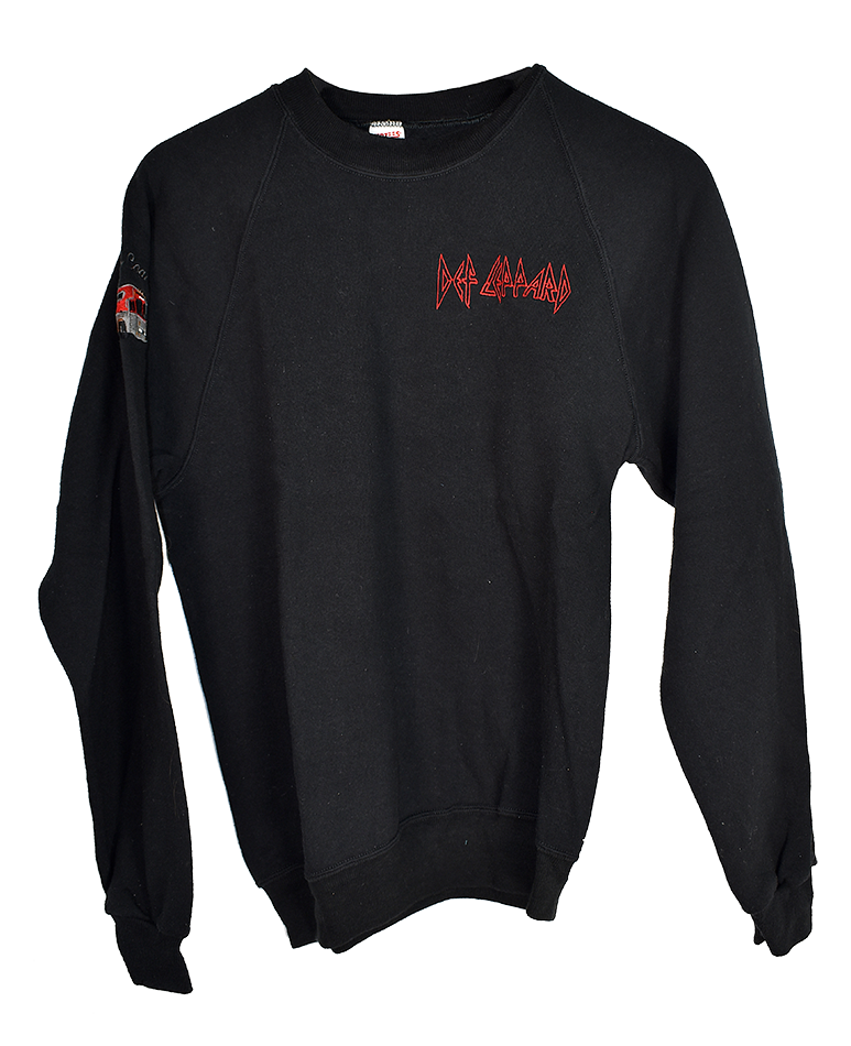 Steve Clark's Jerzees brand black crewneck sweatshirt with red Def Leppard logo embroidered on breast and "Senators Coaches" with bus embroidered on right sleeve. Senators Coaches has been around since 1978, and is one of the oldest rock 'n roll touring bus companies in America. Courtesy of the Lorelei Shellist Private Collection.