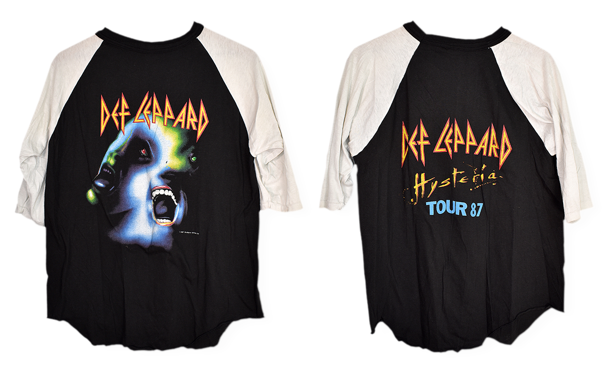 Steve Clark's black baseball tee with white mid-length sleeves and Hysteria design on the chest. "Def Leppard Hysteria Tour 87" on the back. Good condition, but with signs of wear. Courtesy of the Lorelei Shellist Private Collection.