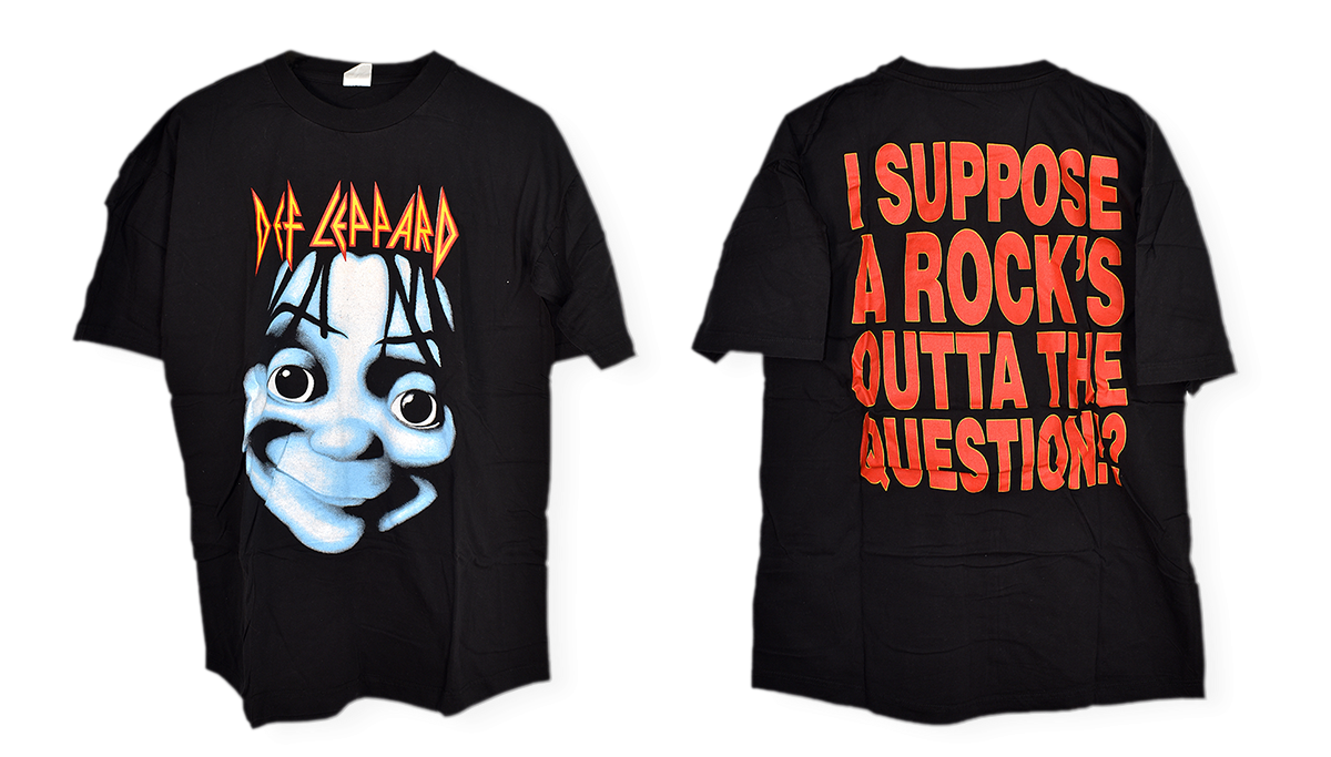 Made for the 1992 Adrenalized Tour merchandise, this black tee with the Def Leppard logo above a closeup of Flynn from the "Let's Get Rocked" music video. The back asks "I suppose a rock's outta the question?" in red. In good condition. Courtesy of the Lorelei Shellist Private Collection.