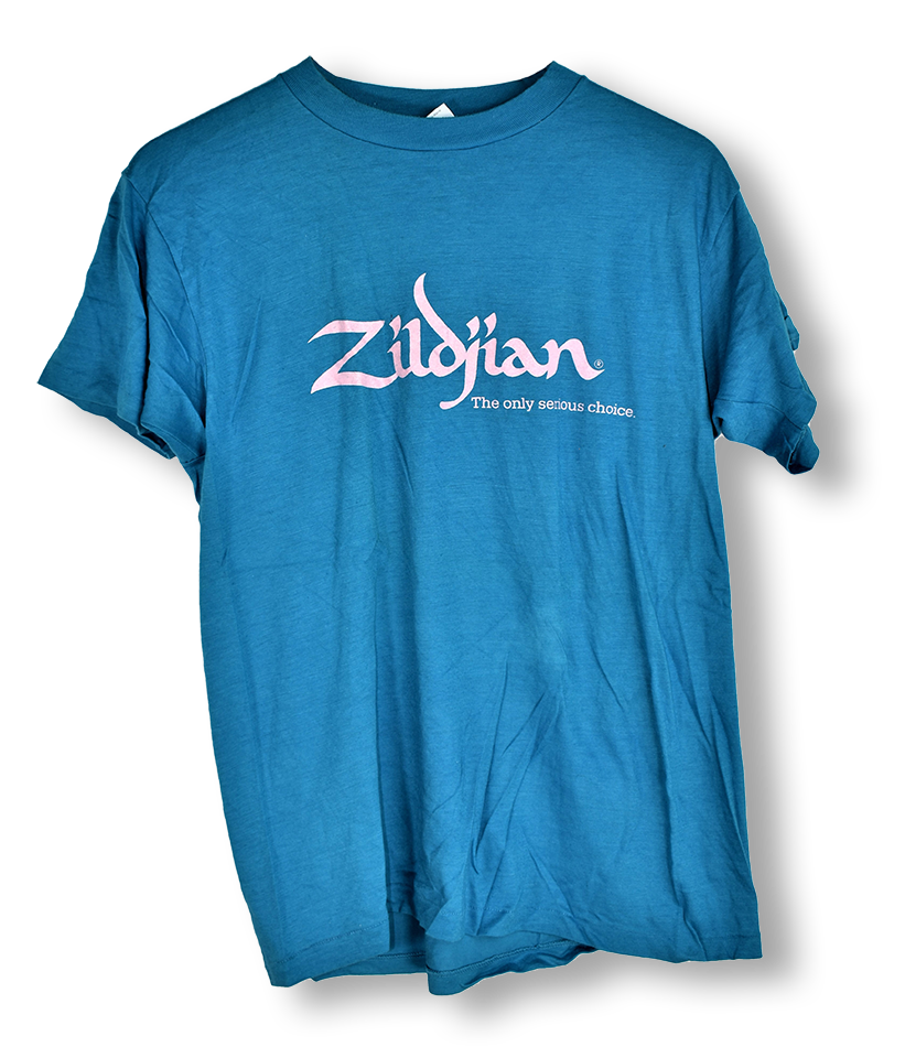 Steve Clark's personal t-shirt with the Zildjian logo in pink on the front, and "Avedis Zildjian Co. Genuine Turkish Cymbals Made In USA" printed on the back. Steve was known to hit a Zildjian cymbal with the neck of his guitar a time or two. The company is the largest cymbal and drumstick maker in the world, and was founded in Constantinople by Avedis Zildjian in 1623. In good condition. Courtesy of the Lorelei Shellist Private Collection.