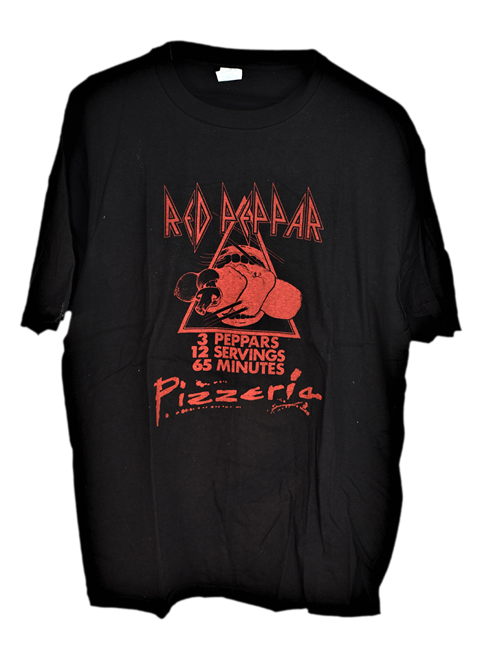 That's a spicy t-shirt! A rare Andie Airfix-designed Def Leppard satire tee that belonged to Steve Clark. This black "Red Peppar" t-shirt reads "3 Peppars 12 servings 65 minutes" and underneath, "Pizzeria" in the Hysteria font. Delicious. From the collection of Lorelei Shellist.