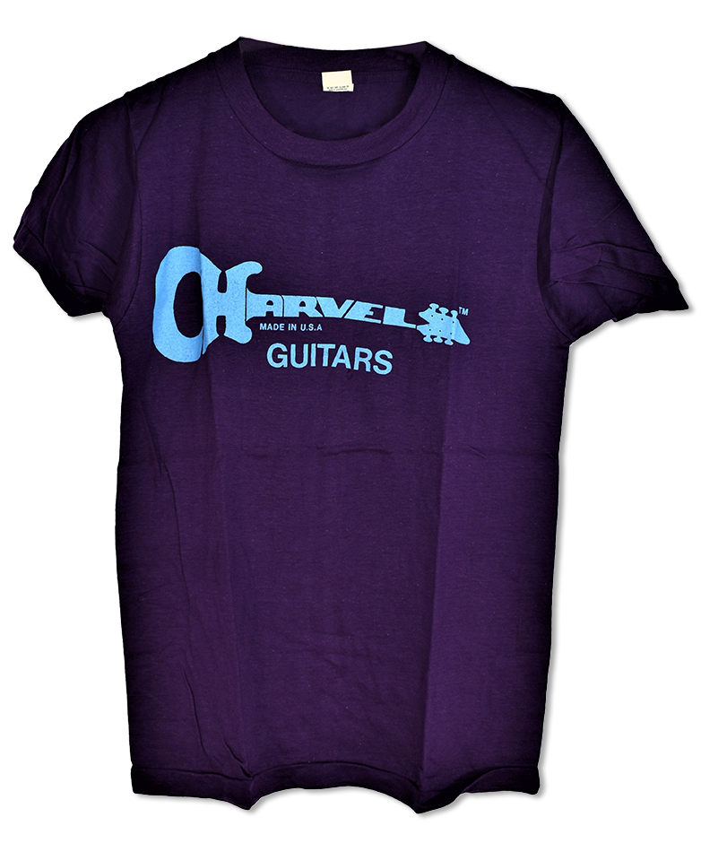 Steve Clark's awesome purple Charvel Guitars tee, with baby blue Charvel logo printed on the front, and baby blue Jackson Guitars logo printed on the back. Charvel was founded in the 1970's by Wayne Charvel in Azusa, California, and is now owned by Fender. Courtesy of the Lorelei Shellist Private Collection.