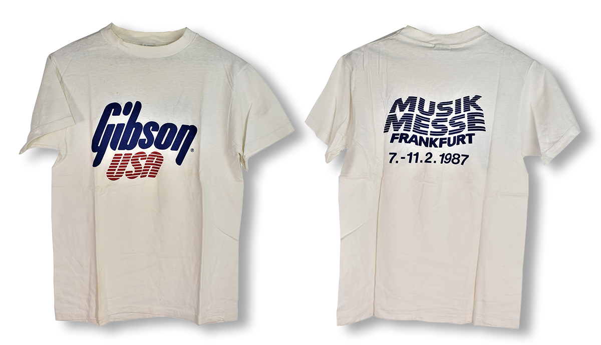 Steve Clark's personal Gibson Musikmesse t-shirt. Gibson logo printed on the front, "Musik Messe Frankfurt 7-11.2.1987" printed on the back. Musikmesse is Europe's biggest fair for the music industry, music instruments and music education, occurring every February since 1980. Courtesy of the Lorelei Shellist Private Collection.